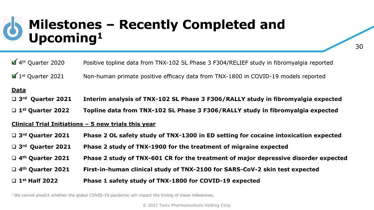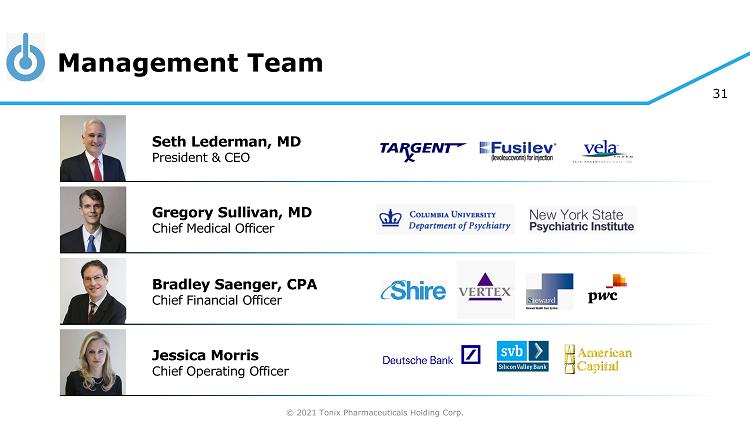 © 2021 Tonix Pharmaceuticals Holding Corp. 30 Milestones – Recently Completed and Upcoming 1 □ 4 th Quarter 2020 Positive topline data from TNX - 102 SL Phase 3 F304/RELIEF study in fibromyalgia reported □ 1 st Quarter 2021 Non - human primate positive efficacy data from TNX - 1800 in COVID - 19 models reported Data □ 3 rd Quarter 2021 Interim analysis of TNX - 102 SL Phase 3 F306/RALLY study in fibromyalgia expected □ 1 st Quarter 2022 Topline data from TNX - 102 SL Phase 3 F306/RALLY study in fibromyalgia expected Clinical Trial Initiations – 5 new trials this year □ 3 rd Quarter 2021 Phase 2 OL safety study of TNX - 1300 in ED setting for cocaine intoxication expected □ 3 rd Quarter 2021 Phase 2 study of TNX - 1900 for the treatment of migraine expected □ 4 th Quarter 2021 Phase 2 study of TNX - 601 CR for the treatment of major depressive disorder expected □ 4 th Quarter 2021 First - in - human clinical study of TNX - 2100 for SARS - CoV - 2 skin test expected □ 1 st Half 2022 Phase 1 safety study of TNX - 1800 for COVID - 19 expected 1 We cannot predict whether the global COVID - 19 pandemic will impact the timing of these milestones. x x