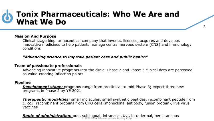 © 2021 Tonix Pharmaceuticals Holding Corp. 2 Cautionary Note on Forward - Looking Statements Certain statements in this presentation regarding strategic plans, expectations and objectives for future operations or results are “forward - looking statements” as defined by the Private Securities Litigation Reform Act of 1995 . These statements may be identified by the use of forward - looking words such as “anticipate,” “believe,” “forecast,” “estimate” and “intend,” among others . These forward - looking statements are based on Tonix’s current expectations and actual results could differ materially . There are a number of factors that could cause actual events to differ materially from those indicated by such forward - looking statements . These factors include, but are not limited to, risks related to failure to obtain U . S . Food and Drug Administration clearances or approvals and noncompliance with its regulations ; our need for additional financing ; delays and uncertainties caused by the global COVID - 19 pandemic ; substantial competition ; uncertainties of patent protection and litigation ; uncertainties of government or third party payor reimbursement ; limited research and development efforts and dependence upon third parties . As with any pharmaceutical under development, there are significant risks in the development, regulatory approval and commercialization of new products . The forward - looking statements in this presentation are made as of the date of this presentation, even if subsequently made available by Tonix on its website or otherwise . Tonix does not undertake an obligation to update or revise any forward - looking statement, except as required by law . Investors should read the risk factors set forth in the Annual Report on Form 10 - K for the year ended December 31 , 2020 , as filed with the Securities and Exchange Commission (the “SEC”) on March 15 , 2021 , and periodic reports and current reports filed with the SEC on or after the date thereof . All of Tonix's forward - looking statements are expressly qualified by all such risk factors and other cautionary statements .