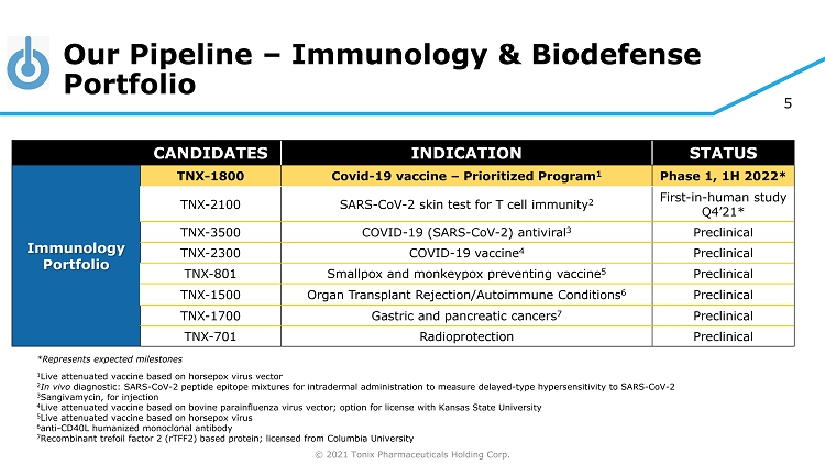 © 2021 Tonix Pharmaceuticals Holding Corp. 4 Our Pipeline – CNS Portfolio CANDIDATES INDICATION STATUS CNS Portfolio TNX - 102 SL 1 Fibromyalgia (FM) - Lead Program Mid - Phase 3 – ongoing PTSD Phase 3 ready Agitation in Alzheimer’s Phase 2 ready Alcohol Use Disorder Long COVID (PASC 2 ) Phase 2 ready Clinical – pre - IND 3 TNX - 1300 4 Cocaine Intoxication / Overdose Phase 2 TNX - 1900 5 Migraine and Craniofacial Pain Clinical – pre - IND 6 TNX - 2900 7 Prader - Willi Syndrome Clinical – pre - IND TNX - 601 CR Depression, PTSD, Neurocognitive Dysfunction from Steroids Clinical – pre - IND 8 TNX - 1600 9 Depression, PTSD and ADHD Preclinical 1 TNX - 102 SL (cyclobenzaprine HCl sublingual tablets) is an investigational new drug and has not been approved for any indication. 2 Post - Acute Sequelae of COVID - 19. 3 Pre - IND (Investigational New Drug) meeting with the FDA scheduled for third quarter 2021 to seek agreement on design of a potent ial Phase 2 pivotal study. 4 TNX - 1300 (double - mutant cocaine esterase) is an investigational new biologic and has not been approved for any indication; licensed from Columbia University . 5 Acquired from Trigemina ; license agreement with Stanford University 6 A Phase 2 trial under an investigator - initiated IND has been completed in the U.S. using TNX - 1900; Phase 2 expected to start Q3’ 21 7 Co - exclustive license agreement with French National Institute of Health and Medical Research ( Inserm ) 8 TN X - 601 CR is in the pre - IND stage in the U.S.; a Phase 1 trial for formulation development was completed outside of the U.S; Phase 2 expected to start Q4’21 9 Acquired from TRImaran Pharma; license agreement with Wayne State University
