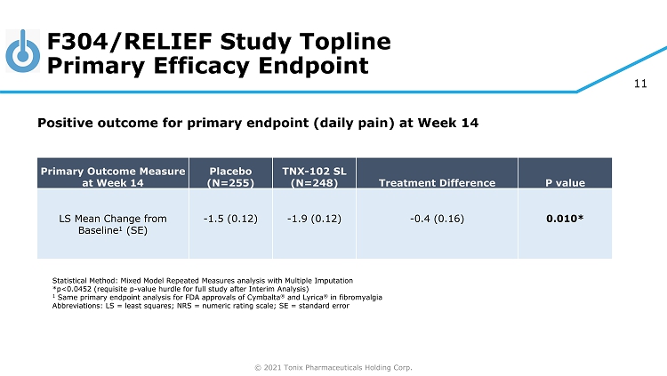 © 2021 Tonix Pharmaceuticals Holding Corp. 10 Phase 3 F304/RELIEF Study: Design Primary e ndpoint (Week 14) : • Daily diary pain severity score change from baseline Key Secondary e ndpoint s (Week 14): Symptom Relief • PROMIS Sleep Disturbance instrument T - score • PROMIS Fatigue instrument T - score • FIQ - R Symptom Domain score Global function • PGIC responder analysis • FIQ - R Function Domain score Pivotal efficacy study to support NDA approval Placebo once - daily at bedtime 14 weeks TNX - 102 SL once - daily at bedtime 5.6 mg (2 x 2.8 mg tablets) 1 General s tudy c haracteristics: • Randomized, double - blind, placebo - controlle d study in fibromyalgia • Adaptive Design: one unblinded interim analysis based on 50% of randomized participants 1 Two week run in at 2.8 mg dose at bedtime, followed by 12 weeks at 5.6 mg dose N= 255 N= 248