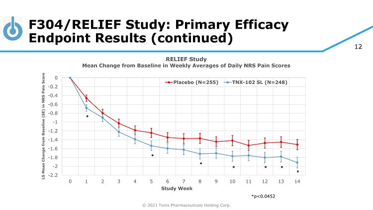 © 2021 Tonix Pharmaceuticals Holding Corp. 11 F304/RELIEF Study Topline Primary Efficacy Endpoint ◊ ◊ Primary Outcome Measure at Week 14 Placebo (N=255) TNX - 102 SL (N=248) Treatment Difference P value LS Mean Change from Baseline 1 (SE) - 1.5 (0.12) - 1.9 (0.12) - 0.4 (0.16) 0.010* Statistical Method: Mixed Model Repeated Measures analysis with Multiple Imputation *p<0.0452 (requisite p - value hurdle for full study after Interim Analysis) 1 Same primary endpoint analysis for FDA approvals of Cymbalta ® and Lyrica ® in fibromyalgia Abbreviations: LS = least squares; NRS = numeric rating scale; SE = standard error Positive outcome for primary endpoint (d aily pain) at Week 14