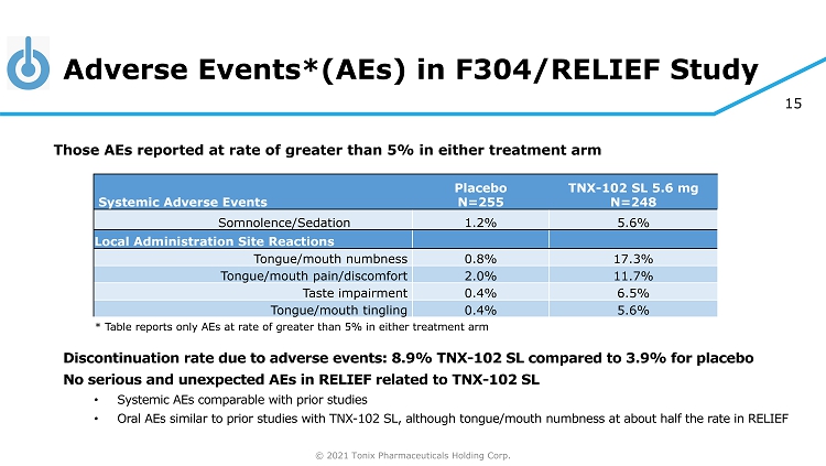 © 2021 Tonix Pharmaceuticals Holding Corp. 14 F304/RELIEF Study: Key Secondary Efficacy Endpoints ◊ ◊ *TNX - 102 SL is in clinical stage of development and not approved for any indication Outcome Measure at Week 14 Intent - to - Treat Analysis 1 P - value Non - Specific Patient Global Impression of Change Responder Analysis: Proportion “Much Improved” or “Very Much Improved” 0.058 Fibromyalgia Syndrome - Related FIQ - R Symptom Domain Mean Change from Baseline 0.007 # FIQ - R Function Domain Mean Change from Baseline 0.009 # PROMIS Fatigue Mean Change from Baseline 0.018 # Daily Sleep Quality Diary, NRS Mean Change from Baseline <0.001 # PROMIS Sleep Disturbance Mean Change from Baseline <0.001 # # nominally significant at p<0.0452 1 Combined periods (pre - and post - interim analysis); responder analysis is by Logistic Regression (missing = non - responder); the f ive mean change analyses are by Mixed Model Repeated Measures with Multiple Imputation Abbreviations: FIQ - R = Fibromyalgia Impact Questionnaire – Revised; NRS = numeric rating scale; PROMIS = Patient - Reported Outcomes Measurement Information System