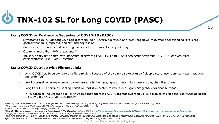 © 2021 Tonix Pharmaceuticals Holding Corp. 19 TNX - 102 SL for Long COVID (PASC) Long COVID or Post - acute Sequelae of COVID - 19 (PASC) • Symptoms can include fatigue, sleep disorders, pain, fevers, shortness of breath, cognitive impairment described as “brain fo g”, gastrointestinal symptoms, anxiety, and depression • Can persist for months and can range in severity from mild to incapacitating • Occurs in more than 30% of patients. 2 • While typically associated with moderate or severe COVID - 19, Long COVID can occur after mild COVID - 19 or even after asymptomatic SARS - CoV - 2 infection Long COVID Overlap with Fibromyalgia • Long COVID has been compared to fibromyalgia because of the common symptoms of sleep disturbance, persistent pain, fatigue, and brain fog 3 • L ike fibromyalgia, is experienced by women at a higher rate, approximately four times more, than that of men 4 • Long COVID is a chronic disabling condition that is expected to result in a significant global economic burden 5 • In response to the urgent need for therapies that address PASC, Congress awarded $1.15 billion to the National Institutes of Hea lth to study Long COVID last December 8 • Ability of vaccines to prevent Long COVID is unknown • No approved drug for the treatment of PASC 1 Feb. 24, 2021 - White House COVID - 19 Response Team press briefing; Feb 25, 2021 - policy brief from the World Health Organizatio n on long COVID 2 Nalbandian, Ani, et al . "Post - acute COVID - 19 syndrome . " Nature Medicine ( 2021 ) : 1 - 15 . 3 Clauw DJ, et al. Pain . 2020 Aug; 161(8): 1694 – 1697. 4 Cox, D. “Why are women more prone to long Covid? “ The Guardian. 13 Jun 2021 https://www.theguardian.com/society/2021/jun/13/why - are - women - more - prone - to - long - covid 5 Briggs, Andrew, and Anna Vassall . "Count the cost of disability caused by COVID - 19." (2021): 502 - 505. 6 The NIH provision of Title III Health and Human Services, Division M -- Coronavirus Response and Relief Supplemental Appropriations Act, 2021 , of H . R . 133 , The Consolidated Appropriations Act of 2021 . The bill was enacted into law on 27 December 2020 , becoming Public Law 116 - 260 .