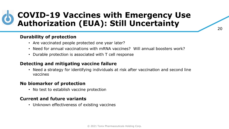 © 2021 Tonix Pharmaceuticals Holding Corp. 20 COVID - 19 Vaccines with Emergency Use Authorization (EUA): Still Uncertainty Durability of protection • Are vaccinated people protected one year later? • Need for annual vaccinations with mRNA vaccines? Will annual boosters work? • Durable protection is associated with T cell response Detecting and mitigating vaccine failure • Need a strategy for identifying individuals at risk after vaccination and second line vaccines No biomarker of protection • No test to establish vaccine protection Current and future variants • Unknown effectiveness of existing vaccines