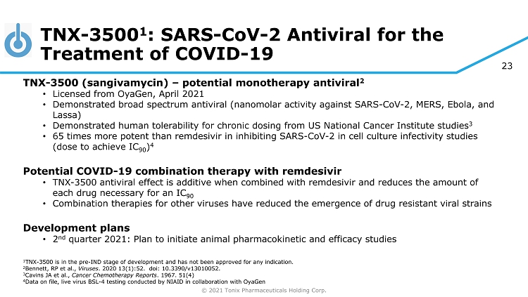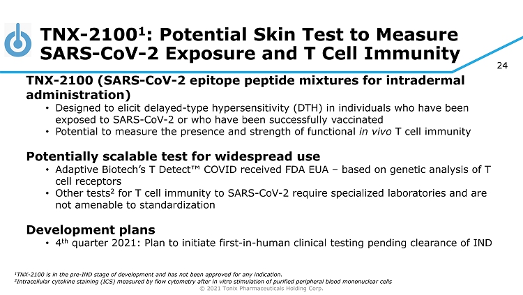 © 2021 Tonix Pharmaceuticals Holding Corp. 23 TNX - 3500 1 : SARS - CoV - 2 Antiviral for the Treatment of COVID - 19 TNX - 3500 (sangivamycin) – potential monotherapy antiviral 2 • Licensed from OyaGen , April 2021 • Demonstrated broad spectrum antiviral (nanomolar activity against SARS - CoV - 2, MERS, Ebola, and Lassa) • Demonstrated human tolerability for chronic dosing from US National Cancer Institute studies 3 • 65 times more potent than remdesivir in inhibiting SARS - CoV - 2 in cell culture infectivity studies (dose to achieve IC 90 ) 4 Potential COVID - 19 combination therapy with remdesivir • TNX - 3500 antiviral effect is additive when combined with remdesivir and reduces the amount of each drug necessary for an IC 90 • Combination therapies for other viruses have reduced the emergence of drug resistant viral strains Development plans • 2 nd quarter 2021: Plan to initiate animal pharmacokinetic and efficacy studies 1 TNX - 3500 is in the pre - IND stage of development and has not been approved for any indication. 2 Bennett, RP et al., Viruses . 2020 13(1):52. doi : 10.3390/v13010052. 3 Cavins JA et al., Cancer Chemotherapy Reports . 1967. 51(4) 4 Data on file, live virus BSL - 4 testing conducted by NIAID in collaboration with OyaGen