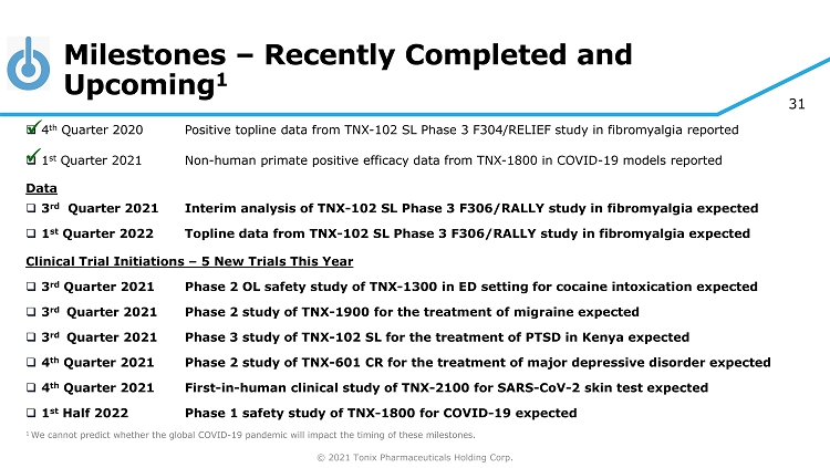 © 2021 Tonix Pharmaceuticals Holding Corp. 30 TNX - 1500, a New CD40 Ligand (CD40L) Antibody, for the Prevention of Allograft Rejection The CD40 - CD40L pathway is a pivotal immune system modulator and is a well - established and very promising treatment target to more safely prevent allograft rejection 1 • First Generation: Development halted due to thromboembolic complications (TE) – blood clots . TE complications traced to Fc gamma receptor • Second Generation: Eliminated the Fc gamma receptor (TE complication) but potency and half life reduced which limited utility • TNX - 1500 Third Generation : Re - engineered based on greater understanding of the Fc gamma receptor. Modulated the binding of FcyR while preserving FcRn function • Expected to deliver efficacy without compromising safety Tonix expects to have GMP product ready in the 3 rd quarter of 2021 for TNX - 1500 1. Camilleri B, et al. Exp Clin Transplant. 2016;14(5):471 - 483. Ruplizumab full Fab Selectively Modified Anti - CD40L Ab TNX - 1500 contains the full ruplizumab Fab and the engineered Fc region that modulates Fc γ R - binding, while preserving FcRn function. Mutated Fc γ R - binding region FcRn - binding region Fc γ R - modulated Fc region