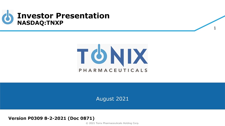 © 2021 Tonix Pharmaceuticals Holding Corp. 1 August 2021 Investor Presentation NASDAQ:TNXP Version P0309 8 - 2 - 2021 (Doc 0871)