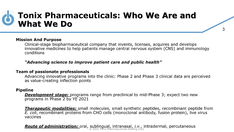 © 2021 Tonix Pharmaceuticals Holding Corp. 2 Cautionary Note on Forward - Looking Statements Certain statements in this presentation regarding strategic plans, expectations and objectives for future operations or results are “forward - looking statements” as defined by the Private Securities Litigation Reform Act of 1995 . These statements may be identified by the use of forward - looking words such as “anticipate,” “believe,” “forecast,” “estimate” and “intend,” among others . These forward - looking statements are based on Tonix’s current expectations and actual results could differ materially . There are a number of factors that could cause actual events to differ materially from those indicated by such forward - looking statements . These factors include, but are not limited to , risks related to failure to obtain U . S . Food and Drug Administration clearances or approvals and noncompliance with its regulations ; our need for additional financing ; delays and uncertainties caused by the global COVID - 19 pandemic ; substantial competition ; uncertainties of patent protection and litigation ; uncertainties of government or third party payor reimbursement ; limited research and development efforts and dependence upon third parties . As with any pharmaceutical under development, there are significant risks in the development, regulatory approval and commercialization of new products . The forward - looking statements in this presentation are made as of the date of this presentation, even if subsequently made available by Tonix on its website or otherwise . Tonix does not undertake an obligation to update or revise any forward - looking statement, except as required by law . Investors should read the risk factors set forth in the Annual Report on Form 10 - K for the year ended December 31 , 2020 , as filed with the Securities and Exchange Commission (the “SEC”) on March 15 , 2021 , and periodic reports and current reports filed with the SEC on or after the date thereof . All of Tonix's forward - looking statements are expressly qualified by all such risk factors and other cautionary statements .