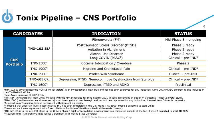 © 2021 Tonix Pharmaceuticals Holding Corp. 3 Tonix Pharmaceuticals: Who We Are and What We Do Mission And Purpose Clinical - stage biopharmaceutical company that invents, licenses, acquires and develops innovative medicines to help patients manage central nervous system (CNS) and immunology conditions “Advancing science to improve patient care and public health” Team of passionate professionals Advancing innovative programs into the clinic: Phase 2 and Phase 3 clinical data are perceived as value - creating inflection points Pipeline Development stage: programs range from preclinical to mid - Phase 3; expect two new programs in Phase 2 by YE 2021 Therapeutic modalities: small molecules, small synthetic peptides, recombinant peptide from E. coli , recombinant proteins from CHO cells (monoclonal antibody, fusion protein), live virus vaccines Route of administration: oral, sublingual, intranasal, i.v. , intradermal, percutaneous