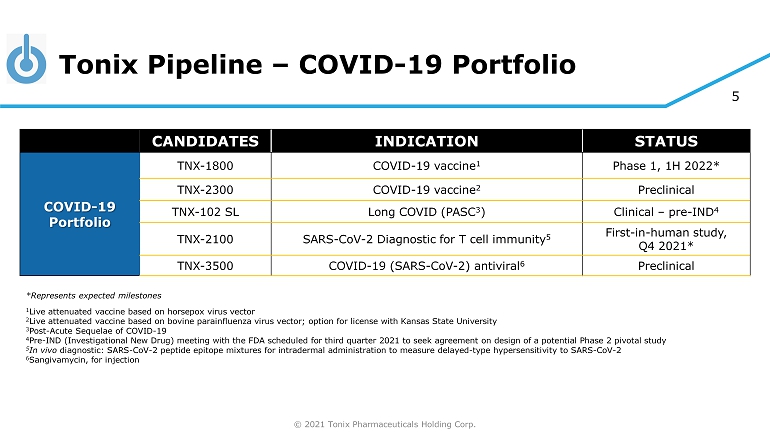 © 2021 Tonix Pharmaceuticals Holding Corp. 4 Tonix Pipeline – CNS Portfolio CANDIDATES INDICATION STATUS CNS Portfolio TNX - 102 SL 1 Fibromyalgia (FM) Mid - Phase 3 – ongoing Posttraumatic Stress Disorder (PTSD) Phase 3 ready Agitation in Alzheimer’s Phase 2 ready Alcohol Use Disorder Long COVID (PASC 2 ) Phase 2 ready Clinical – pre - IND 3 TNX - 1300 4 Cocaine Intoxication / Overdose Phase 2 TNX - 1900 5 Migraine and Craniofacial Pain Clinical – pre - IND 6 TNX - 2900 7 Prader - Willi Syndrome Clinical – pre - IND TNX - 601 CR Depression, PTSD, Neurocognitive Dysfunction from Steroids Clinical – pre - IND 8 TNX - 1600 9 Depression, PTSD and ADHD Preclinical 1 TNX - 102 SL (cyclobenzaprine HCl sublingual tablets) is an investigational new drug and has not been approved for any indication. Long COVID/PASC program is also included in the COVID - 19 Portfolio. 2 Post - Acute Sequelae of COVID - 19. 3 Pre - IND (Investigational New Drug) meeting with the FDA scheduled for third quarter 2021 to seek agreement on design of a potent ial Phase 2 pivotal study. 4 TNX - 1300 (double - mutant cocaine esterase) is an investigational new biologic and has not been approved for any indication; licensed from Columbia University . 5 Acquired from Trigemina ; license agreement with Stanford University 6 A Phase 2 trial under an investigator - initiated IND has been completed in the U.S. using TNX - 1900; Phase 2 expected to start Q3’ 21 7 Co - exclustive license agreement with French National Institute of Health and Medical Research ( Inserm ) 8 TN X - 601 CR is in the pre - IND stage in the U.S.; a Phase 1 trial for formulation development was completed outside of the U.S; Phase 2 expected to start 1H 2022 9 Acquired from TRImaran Pharma; license agreement with Wayne State University