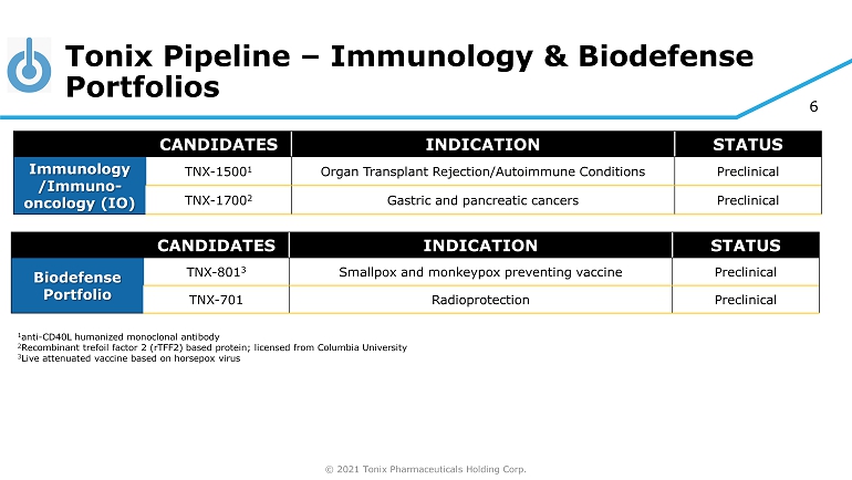 © 2021 Tonix Pharmaceuticals Holding Corp. 5 Tonix Pipeline – COVID - 19 Portfolio CANDIDATES INDICATION STATUS COVID - 19 Portfolio TNX - 1800 COVID - 19 vaccine 1 Phase 1, 1H 2022* TNX - 2300 COVID - 19 vaccine 2 Preclinical TNX - 102 SL Long COVID (PASC 3 ) Clinical – pre - IND 4 TNX - 2100 SARS - CoV - 2 Diagnostic for T cell immunity 5 First - in - human study, Q4 2021* TNX - 3500 COVID - 19 (SARS - CoV - 2) antiviral 6 Preclinical *Represents expected milestones 1 Live attenuated vaccine based on horsepox virus vector 2 Live attenuated vaccine based on bovine parainfluenza virus vector; option for license with Kansas State University 3 Post - Acute Sequelae of COVID - 19 4 Pre - IND (Investigational New Drug) meeting with the FDA scheduled for third quarter 2021 to seek agreement on design of a potent ial Phase 2 pivotal study 5 In vivo diagnostic: SARS - CoV - 2 peptide epitope mixtures for intradermal administration to measure delayed - type hypersensitivity to SARS - CoV - 2 6 Sangivamycin, for injection