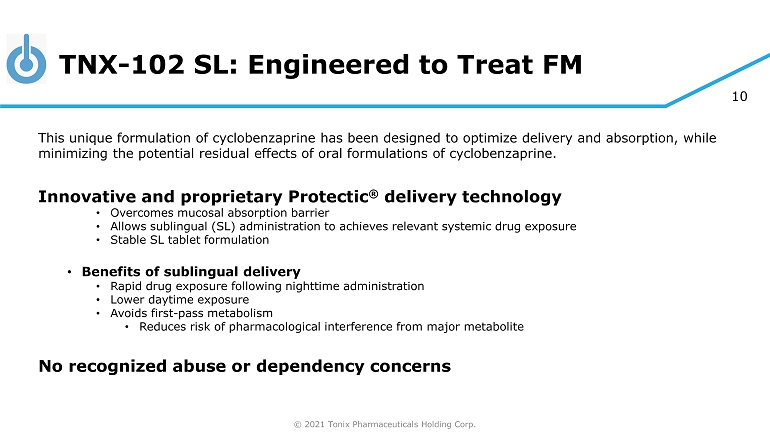© 2021 Tonix Pharmaceuticals Holding Corp. 9 Fibromyalgia Unmet Need and Ideal Treatment Profile Unmet Medical Need: Current treatment patterns indicate that new, more effective, and better - tolerated treatments are necessary for management of FM 1 Source: 1. Yang, et al, 2016 Ideal Treatment Profile: Treats FM as a syndrome Relief from major symptoms (pain, sleep disturbances, fatigue) Reduces disability and improves daily living (global function) Well tolerated with low discontinuation • Low systemic side - effects • No daytime somnolence • No weight gain or impact on sexual function Suitable for chronic use • Not scheduled • Non opioid • Non abuse potential