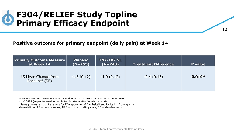 © 2021 Tonix Pharmaceuticals Holding Corp. 11 Phase 3 F304/RELIEF Study: Design Primary e ndpoint (Week 14) : • Daily diary pain severity score change from baseline Key Secondary e ndpoint s (Week 14): Symptom Relief • PROMIS Sleep Disturbance instrument T - score • PROMIS Fatigue instrument T - score • FIQ - R Symptom Domain score Global function • PGIC responder analysis • FIQ - R Function Domain score Pivotal efficacy study to support NDA approval Placebo once - daily at bedtime 14 weeks TNX - 102 SL once - daily at bedtime 5.6 mg (2 x 2.8 mg tablets) 1 General s tudy c haracteristics: • Randomized, double - blind, placebo - controlle d study in fibromyalgia • Adaptive Design: one unblinded interim analysis based on 50% of randomized participants 1 Two week run in at 2.8 mg dose at bedtime, followed by 12 weeks at 5.6 mg dose N= 255 N= 248