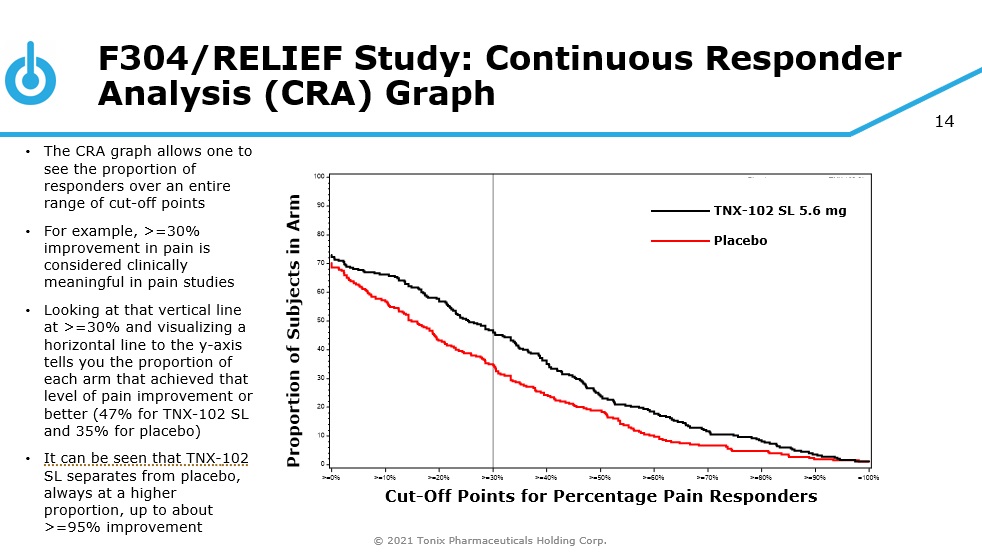 © 2021 Tonix Pharmaceuticals Holding Corp. 13 F304/RELIEF Study: Primary Efficacy Endpoint Results (continued) -2.2 -2 -1.8 -1.6 -1.4 -1.2 -1 -0.8 -0.6 -0.4 -0.2 0 0 1 2 3 4 5 6 7 8 9 10 11 12 13 14 LS Mean Change from Baseline (SE) in NRS Pain Score Study Week RELIEF Study Mean Change from Baseline in Weekly Averages of Daily NRS Pain Scores Placebo (N=255) TNX-102 SL (N=248) * * * * * * * *p<0.0452