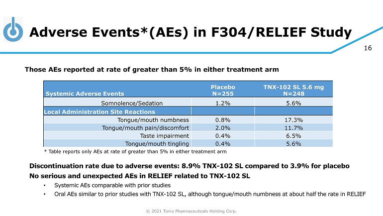 © 2021 Tonix Pharmaceuticals Holding Corp. 15 F304/RELIEF Study: Key Secondary Efficacy Endpoints ◊ ◊ *TNX - 102 SL is in clinical stage of development and not approved for any indication Outcome Measure at Week 14 Intent - to - Treat Analysis 1 P - value Non - Specific Patient Global Impression of Change Responder Analysis: Proportion “Much Improved” or “Very Much Improved” 0.058 Fibromyalgia Syndrome - Related FIQ - R Symptom Domain Mean Change from Baseline 0.007 # FIQ - R Function Domain Mean Change from Baseline 0.009 # PROMIS Fatigue Mean Change from Baseline 0.018 # Daily Sleep Quality Diary, NRS Mean Change from Baseline <0.001 # PROMIS Sleep Disturbance Mean Change from Baseline <0.001 # # nominally significant at p<0.0452 1 Combined periods (pre - and post - interim analysis); responder analysis is by Logistic Regression (missing = non - responder); the f ive mean change analyses are by Mixed Model Repeated Measures with Multiple Imputation Abbreviations: FIQ - R = Fibromyalgia Impact Questionnaire – Revised; NRS = numeric rating scale; PROMIS = Patient - Reported Outcomes Measurement Information System