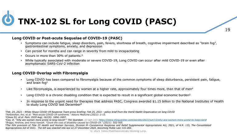 © 2021 Tonix Pharmaceuticals Holding Corp. 19 TNX - 102 SL for Long COVID (PASC) Long COVID or Post - acute Sequelae of COVID - 19 (PASC) • Symptoms can include fatigue, sleep disorders, pain, fevers, shortness of breath, cognitive impairment described as “brain fo g”, gastrointestinal symptoms, anxiety, and depression • Can persist for months and can range in severity from mild to incapacitating • Occurs in more than 30% of patients. 2 • While typically associated with moderate or severe COVID - 19, Long COVID can occur after mild COVID - 19 or even after asymptomatic SARS - CoV - 2 infection Long COVID Overlap with Fibromyalgia • Long COVID has been compared to fibromyalgia because of the common symptoms of sleep disturbance, persistent pain, fatigue, and brain fog 3 • L ike fibromyalgia, is experienced by women at a higher rate, approximately four times more, than that of men 4 • Long COVID is a chronic disabling condition that is expected to result in a significant global economic burden 5 • In response to the urgent need for therapies that address PASC, Congress awarded $1.15 billion to the National Institutes of Hea lth to study Long COVID last December 8 • Ability of vaccines to prevent Long COVID is unknown • No approved drug for the treatment of PASC 1 Feb. 24, 2021 - White House COVID - 19 Response Team press briefing; Feb 25, 2021 - policy brief from the World Health Organizatio n on long COVID 2 Nalbandian, Ani, et al . "Post - acute COVID - 19 syndrome . " Nature Medicine ( 2021 ) : 1 - 15 . 3 Clauw DJ, et al. Pain . 2020 Aug; 161(8): 1694 – 1697. 4 Cox, D. “Why are women more prone to long Covid? “ The Guardian. 13 Jun 2021 https://www.theguardian.com/society/2021/jun/13/why - are - women - more - prone - to - long - covid 5 Briggs, Andrew, and Anna Vassall . "Count the cost of disability caused by COVID - 19." (2021): 502 - 505. 6 The NIH provision of Title III Health and Human Services, Division M -- Coronavirus Response and Relief Supplemental Appropriations Act, 2021 , of H . R . 133 , The Consolidated Appropriations Act of 2021 . The bill was enacted into law on 27 December 2020 , becoming Public Law 116 - 260 .