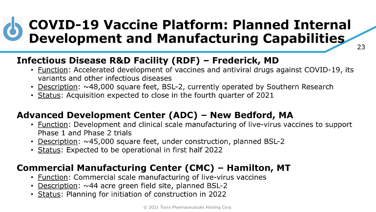 © 2021 Tonix Pharmaceuticals Holding Corp. 22 Potential Profile of TNX - 1800 Compared to EUA Covid - 19 Vaccines Criteria EUA Vaccines TNX - 1800 Number of shots One – two One Duration Unknown Years / decades Boosters Unknown Not required Protection from variants Unknown Likely provides protection Forward Transmission Unknown for variants like delta Likely prevents Biomarker None Yes - “Take” Manufacturing Complex Conventional Glass sparing packaging No Yes Shipping and storage Cold Chain Standard refrigeration Protection from smallpox No Yes