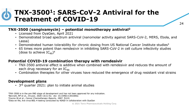 © 2021 Tonix Pharmaceuticals Holding Corp. 23 COVID - 19 Vaccine Platform: Planned Internal Development and Manufacturing Capabilities Infectious Disease R&D Facility (RDF) – Frederick, MD • Function : Accelerated development of vaccines and antiviral drugs against COVID - 19, its variants and other infectious diseases • Description : ~48,000 square feet, BSL - 2, currently operated by Southern Research • Status : Acquisition expected to close in the fourth quarter of 2021 Advanced Development Center (ADC) – New Bedford, MA • Function : Development and clinical scale manufacturing of live - virus vaccines to support Phase 1 and Phase 2 trials • Description : ~45,000 square feet, under construction, planned BSL - 2 • Status : Expected to be operational in first half 2022 Commercial Manufacturing Center (CMC) – Hamilton, MT • Function : Commercial scale manufacturing of live - virus vaccines • Description : ~44 acre green field site, planned BSL - 2 • Status : Planning for initiation of construction in 2022