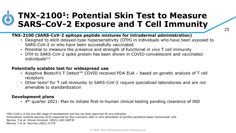 © 2021 Tonix Pharmaceuticals Holding Corp. 24 TNX - 3500 1 : SARS - CoV - 2 Antiviral for the Treatment of COVID - 19 TNX - 3500 (sangivamycin) – potential monotherapy antiviral 2 • Licensed from OyaGen , April 2021 • Demonstrated broad spectrum antiviral (nanomolar activity against SARS - CoV - 2, MERS, Ebola, and Lassa) • Demonstrated human tolerability for chronic dosing from US National Cancer Institute studies 3 • 65 times more potent than remdesivir in inhibiting SARS - CoV - 2 in cell culture infectivity studies (dose to achieve IC 90 ) 4 Potential COVID - 19 combination therapy with remdesivir • TNX - 3500 antiviral effect is additive when combined with remdesivir and reduces the amount of each drug necessary for an IC 90 • Combination therapies for other viruses have reduced the emergence of drug resistant viral strains Development plans • 3 rd quarter 2021: plan to initiate animal studies 1 TNX - 3500 is in the pre - IND stage of development and has not been approved for any indication. 2 Bennett, RP et al., Viruses . 2020 13(1):52. doi : 10.3390/v13010052. 3 Cavins JA et al., Cancer Chemotherapy Reports . 1967. 51(4) 4 Data on file, live virus BSL - 4 testing conducted by NIAID in collaboration with OyaGen