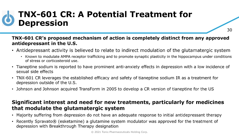 © 2021 Tonix Pharmaceuticals Holding Corp. 29 TNX - 601 CR* (Tianeptine Oxalate and Naloxone HCl Controlled Release) Tablets for the Treatment of Major Depressive Disorder (MDD) Proprietary new controlled release formulation for once - daily dosing • Pending toxicology results, and IND clearance, Phase 2 study expected to start in 1H 2022 • Suitability for once - daily dosing established in Phase 1 pharmacokinetic study, completed outside of the U.S. • Well tolerated in study and side effects were consistent with the known safety profile of tianeptine sodium • Tianeptine sodium immediate release is approved and marketed outside of the U.S. for three times a day dosing for the treatment of depression • Once - daily dosing for TNX - 601 CR believed to have an adherence advantage over three times a day dosing with tianeptine sodium Proprietary new oxalate salt with improved pharmaceutical properties • Tianeptine oxalate is crystalline, while tianeptine sodium is amorphous Issued patents directed to tianeptine and tianeptine oxalate • Composition of Matter: Issued US patent directed to oxalate salt, U.S. Patent No. 10,449,203 and 10,946,027 • Method of Use: Issued European patent directed to methods of treating cognitive impairment associated with corticosteroid treatment, European Patent No. 3246031 *TNX - 601 CR (tianeptine oxalate and naloxone HCl controlled release tablets) is in the pre - IND stage in the U.S. and has not bee n approved for any indication.