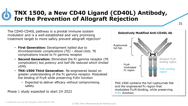 © 2021 Tonix Pharmaceuticals Holding Corp. 31 TNX 1500, a New CD40 Ligand (CD40L) Antibody, for the Prevention of Allograft Rejection The CD40 - CD40L pathway is a pivotal immune system modulator and is a well - established and very promising treatment target to more safely prevent allograft rejection 1 • First Generation: Development halted due to thromboembolic complications (TE) – blood clots . TE complications traced to Fc gamma receptor • Second Generation: Eliminated the Fc gamma receptor (TE complication) but potency and half life reduced which limited utility • TNX - 1500 Third Generation : Re - engineered based on greater understanding of the Fc gamma receptor. Modulated the binding of FcyR while preserving FcRn function • Expected to deliver efficacy without compromising safety Phase 1 study expected to start 2H 2022 1. Camilleri B, et al. Exp Clin Transplant. 2016;14(5):471 - 483. Ruplizumab full Fab Selectively Modified Anti - CD40L Ab TNX - 1500 contains the full ruplizumab Fab and the engineered Fc region that modulates Fc γ R - binding, while preserving FcRn function. Mutated Fc γ R - binding region FcRn - binding region Fc γ R - modulated Fc region