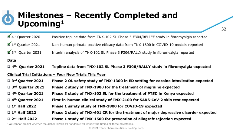 © 2021 Tonix Pharmaceuticals Holding Corp. 32 Milestones – Recently Completed and Upcoming 1 □ 4 th Quarter 2020 Positive topline data from TNX - 102 SL Phase 3 F304/RELIEF study in fibromyalgia reported □ 1 st Quarter 2021 Non - human primate positive efficacy data from TNX - 1800 in COVID - 19 models reported □ 3 rd Quarter 2021 Interim analysis of TNX - 102 SL Phase 3 F306/RALLY study in fibromyalgia reported Data □ 4 th Quarter 2021 Topline data from TNX - 102 SL Phase 3 F306/RALLY study in fibromyalgia expected Clinical Trial Initiations – Four New Trials This Year □ 3 rd Quarter 2021 Phase 2 OL safety study of TNX - 1300 in ED setting for cocaine intoxication expected □ 3 rd Quarter 2021 Phase 2 study of TNX - 1900 for the treatment of migraine expected □ 4 th Quarter 2021 Phase 3 study of TNX - 102 SL for the treatment of PTSD in Kenya expected □ 4 th Quarter 2021 First - in - human clinical study of TNX - 2100 for SARS - CoV - 2 skin test expected □ 1 st Half 2022 Phase 1 safety study of TNX - 1800 for COVID - 19 expected □ 1 st Half 2022 Phase 2 study of TNX - 601 CR for the treatment of major depressive disorder expected □ 2 nd Half 2022 Phase 1 study of TNX - 1500 for prevention of allograft rejection expected 1 We cannot predict whether the global COVID - 19 pandemic will impact the timing of these milestones. x x x