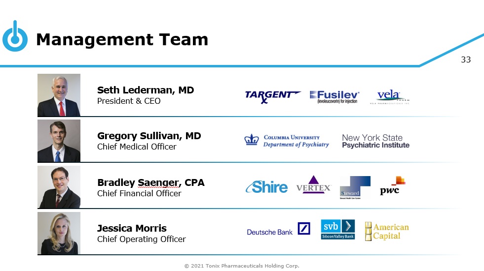 © 2021 Tonix Pharmaceuticals Holding Corp. 33 Management Team Seth Lederman, MD President & CEO Jessica Morris Chief Operating Officer Gregory Sullivan, MD Chief Medical Officer Bradley Saenger , CPA Chief Financial Officer