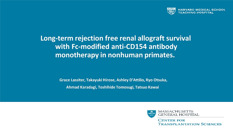Long - term rejection free renal allograft survival with Fc - modified anti - CD154 antibody monotherapy in nonhuman primates. Grace Lassiter, Takayuki Hirose, Ashley D’Attilio, Ryo Otsuka, Ahmad Karadagi, Toshihide Tomosugi, Tatsuo Kawai