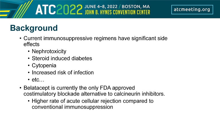 Background • Current immunosuppressive regimens have significant side effects • Nephrotoxicity • Steroid induced diabetes • Cytopenia • Increased risk of infection • etc… • Belatacept is currently the only FDA approved costimulatory blockade alternative to calcineurin inhibitors. • Higher rate of acute cellular rejection compared to conventional immunosuppression