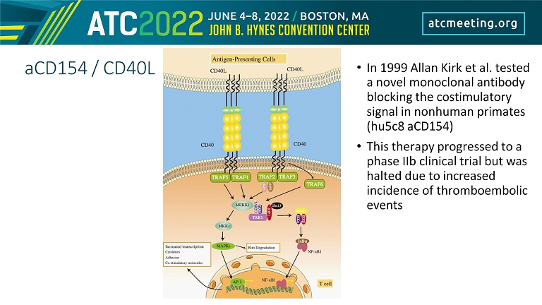 aCD154 / CD40L • In 1999 Allan Kirk et al. tested a novel monoclonal antibody blocking the costimulatory signal in nonhuman primates (hu5c8 aCD154) • This therapy progressed to a phase IIb clinical trial but was halted due to increased incidence of thromboembolic events