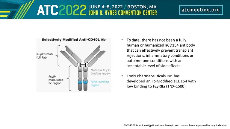 • To date, there has not been a fully human or humanized aCD154 antibody that can effectively prevent transplant rejections, inflammatory conditions or autoimmune conditions with an acceptable level of side effects • Tonix Pharmaceuticals Inc. has developed an Fc - Modified aCD154 with low binding to FcγRIIa (TNX - 1500) TNX - 1500 is an investigational new biologic and has not been approved for any indication