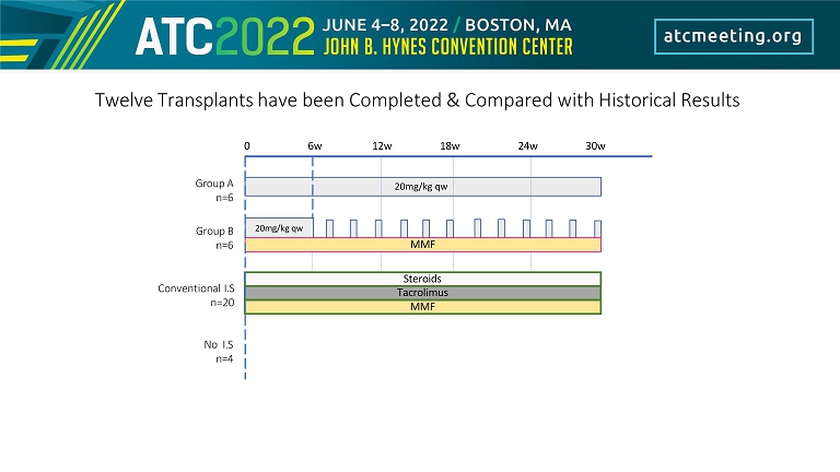 0 6w 12w 18w 24w 30w 20mg/kg qw 20mg/kg qw MMF Tacrolimus Group A n=6 Group B n=6 Conventional I.S n=20 Twelve Transplants have been Completed & Compared with Historical Results Steroids MMF No I.S n=4