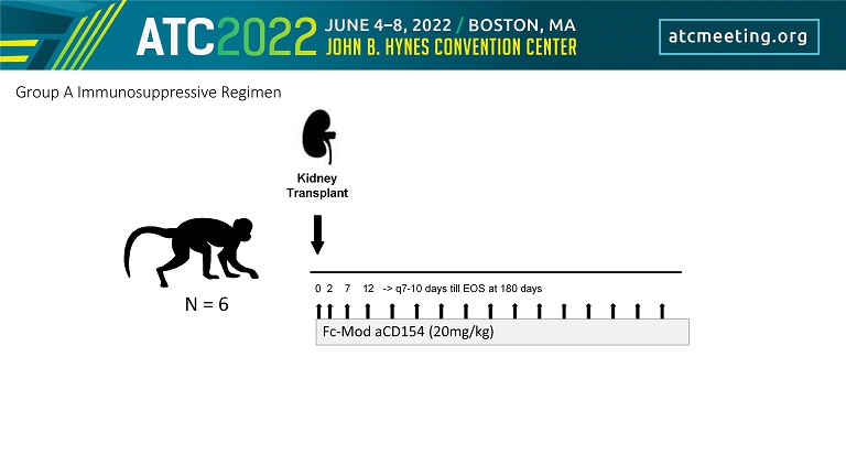 0 2 7 12 - > q7 - 10 days till EOS at 180 days Kidney Transplant Group A Immunosuppressive Regimen N = 6 Fc - Mod aCD154 (20mg/kg)