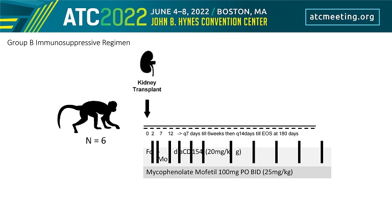 0 2 7 12 - > q7 days till 6weeks then q14days till EOS at 180 days Fc - Mo d aCD 154 (20mg/k g) Mycophenolate Mofetil 100mg PO BID (25mg/kg) Kidney Transplant N = 6 Group B Immunosuppressive Regimen