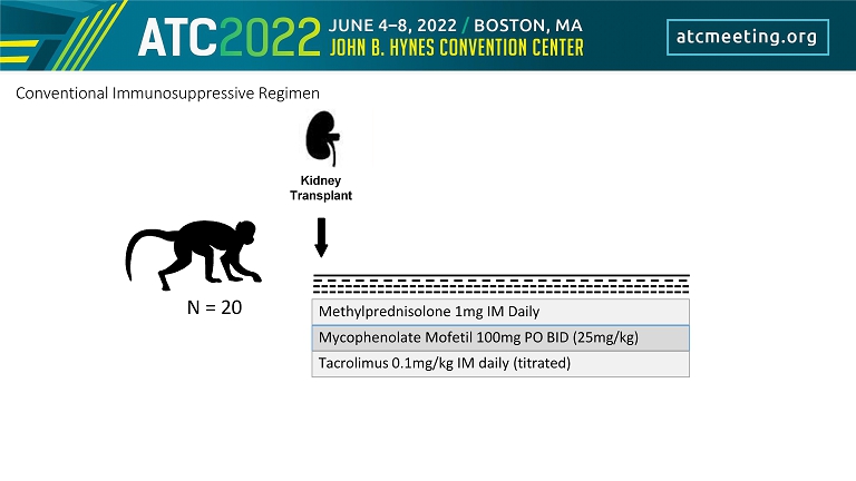 Methylprednisolone 1mg IM Daily Mycophenolate Mofetil 100mg PO BID (25mg/kg) Tacrolimus 0.1mg/kg IM daily (titrated) Kidney Transplant N = 20 Conventional Immunosuppressive Regimen