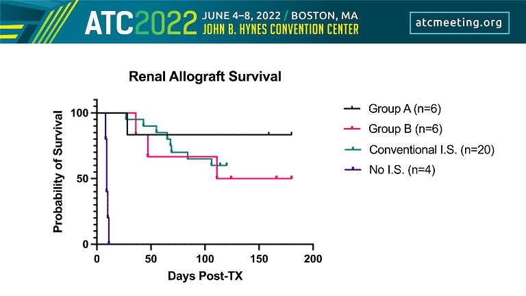 Group TNX - 1500 MMF Tac Pred Renal allograft survival (days) A weekly - - - >180,>180, >180, >180, >159, 28 Rapid rejectors B weekly for 6 weeks, followed by every 2 weeks daily - - >180, >166, >124, 111, 36, 48 Conventional I.S. - daily daily daily >120, >120, >120, >120, >120, >120, >120, >120, >120, >120, >120, 114, 106, 84, 69, 68, 65, 55, 43, 27 No I.S. - - - - 11,10, 9, 9, 8
