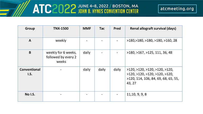 Group TNX - 1500 MMF Tac Pred Renal allograft survival (days) A weekly - - - >180,>180, >180, >180, >160, 28 B weekly for 6 weeks, followed by every 2 weeks daily - - >180, >167, >125, 111, 36, 48 Conventional I.S. - daily daily daily >120, >120, >120, >120, >120, >120, >120, >120, >120, >120, >120, 114, 106, 84, 69, 68, 65, 55, 43, 27 No I.S. - - - - 11,10, 9, 9, 8