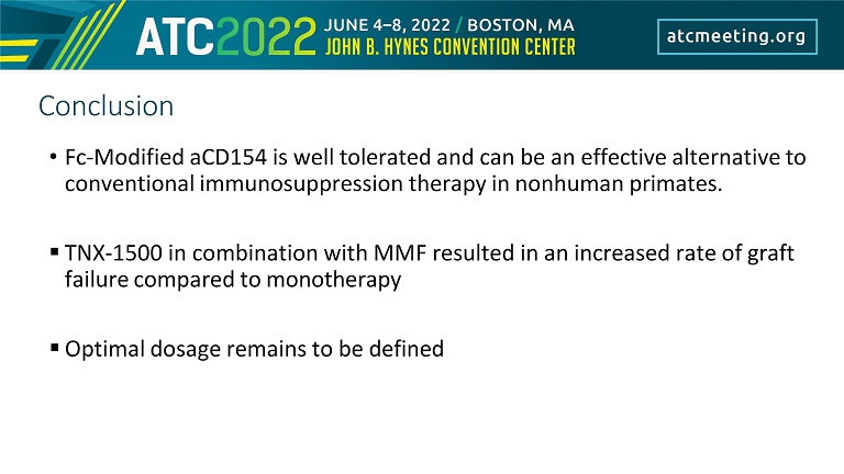 Conclusion • Fc - Modified aCD154 is well tolerated and can be an effective alternative to conventional immunosuppression therapy in nonhuman primates. ▪ TNX - 1500 in combination with MMF resulted in an increased rate of graft failure compared to monotherapy ▪ Optimal dosage remains to be defined
