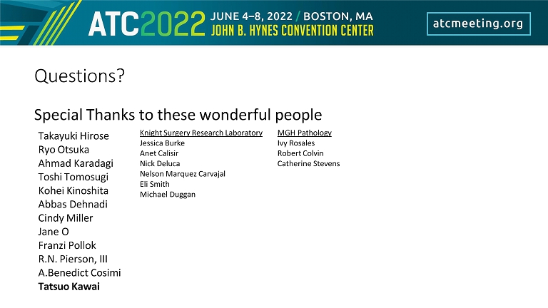 Takayuki Hirose Ryo Otsuka Ahmad Karadagi Toshi Tomosugi Kohei Kinoshita Abbas Dehnadi Cindy Miller Jane O Franzi Pollok R.N. Pierson, III A.Benedict Cosimi Tatsuo Kawai Knight Surgery Research Laboratory Jessica Burke Anet Calisir Nick Deluca Nelson Marquez Carvajal Eli Smith Michael Duggan MGH Pathology Ivy Rosales Robert Colvin Catherine Stevens Questions? Special Thanks to these wonderful people