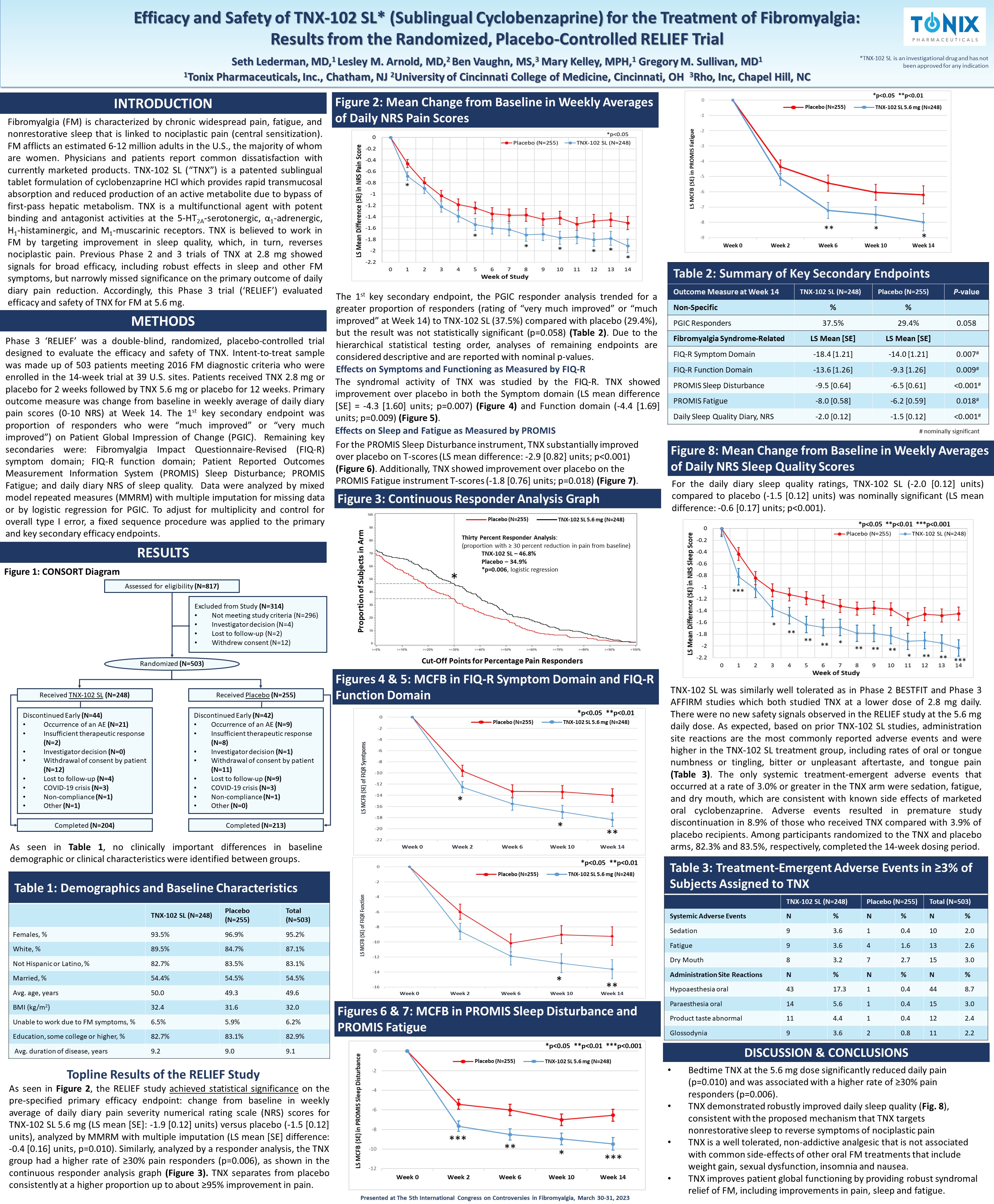 Efficacy and Safety of TNX - 102 SL* (Sublingual Cyclobenzaprine) for the Treatment of Fibromyalgia: Results from the Randomized, Placebo - Controlled RELIEF Trial Seth Lederman, MD, 1 Lesley M. Arnold, MD, 2 Ben Vaughn, MS, 3 Mary Kelley, MPH, 1 Gregory M. Sullivan, MD 1 1 Tonix Pharmaceuticals, Inc., Chatham, NJ 2 University of Cincinnati College of Medicine, Cincinnati, OH 3 Rho, Inc, Chapel Hill, NC *TNX - 102 SL is an investigational drug and has not been approved for any indication INTRODUCTION RESULTS METHODS Fibromyalgia (FM) is characterized by chronic widespread pain, fatigue, and nonrestorative sleep that is linked to nociplastic pain (central sensitization) . FM afflicts an estimated 6 - 12 million adults in the U . S . , the majority of whom are women . Physicians and patients report common dissatisfaction with currently marketed products . TNX - 102 SL (“TNX”) is a patented sublingual tablet formulation of cyclobenzaprine HCl which provides rapid transmucosal absorption and reduced production of an active metabolite due to bypass of first - pass hepatic metabolism . TNX is a multifunctional agent with potent binding and antagonist activities at the 5 - HT 2 A - serotonergic, α 1 - adrenergic, H 1 - histaminergic, and M 1 - muscarinic receptors . TNX is believed to work in FM by targeting improvement in sleep quality, which, in turn, reverses nociplastic pain . Previous Phase 2 and 3 trials of TNX at 2 . 8 mg showed signals for broad efficacy, including robust effects in sleep and other FM symptoms, but narrowly missed significance on the primary outcome of daily diary pain reduction . Accordingly, this Phase 3 trial (‘RELIEF’) evaluated efficacy and safety of TNX for FM at 5 . 6 mg . Phase 3 ‘RELIEF’ was a double - blind, randomized, placebo - controlled trial designed to evaluate the efficacy and safety of TNX . Intent - to - treat sample was made up of 503 patients meeting 2016 FM diagnostic criteria who were enrolled in the 14 - week trial at 39 U . S . sites . Patients received TNX 2 . 8 mg or placebo for 2 weeks followed by TNX 5 . 6 mg or placebo for 12 weeks . Primary outcome measure was change from baseline in weekly average of daily diary pain scores ( 0 - 10 NRS) at Week 14 . The 1 st key secondary endpoint was proportion of responders who were “much improved” or “very much improved”) on Patient Global Impression of Change (PGIC) . Remaining key secondaries were : Fibromyalgia Impact Questionnaire - Revised (FIQ - R) symptom domain ; FIQ - R function domain ; Patient Reported Outcomes Measurement Information System (PROMIS) Sleep Disturbance ; PROMIS Fatigue ; and daily diary NRS of sleep quality . Data were analyzed by mixed model repeated measures (MMRM) with multiple imputation for missing data or by logistic regression for PGIC . To adjust for multiplicity and control for overall type I error, a fixed sequence procedure was applied to the primary and key secondary efficacy endpoints . Figure 1: CONSORT Diagram Assessed for eligibility (N=817) Excluded from Study (N=314) • Not meeting study criteria (N=296) • Investigator decision (N=4) • Lost to follow - up (N=2) • Withdrew consent (N=12) Randomized (N=503) Received TNX - 102 SL (N=248) Received Placebo (N=255) Discontinued Early (N=44) • Occurrence of an AE (N=21) • Insufficient therapeutic response (N=2) • Investigator decision (N=0) • Withdrawal of consent by patient (N=12) • Lost to follow - up (N=4) • COVID - 19 crisis (N=3) • Non - compliance (N=1) • Other (N=1) Discontinued Early (N=42) • Occurrence of an AE (N=9) • Insufficient therapeutic response (N=8) • Investigator decision (N=1) • Withdrawal of consent by patient (N=11) • Lost to follow - up (N=9) • COVID - 19 crisis (N=3) • Non - compliance (N=1) • Other (N=0) Completed (N=204) Completed (N=213) Figures 4 & 5: MCFB in FIQ - R Symptom Domain and FIQ - R Function Domain Figures 6 & 7: MCFB in PROMIS Sleep Disturbance and PROMIS Fatigue Figure 3: Continuous Responder Analysis Graph Table 2: Summary of Key Secondary Endpoints P - value Placebo (N=255) TNX - 102 SL (N=248) Outcome Measure at Week 14 % % Non - Specific 0.058 29.4% 37.5% PGIC Responders LS Mean [SE] LS Mean [SE] Fibromyalgia Syndrome - Related 0.007 # - 14.0 [1.21] - 18.4 [1.21] FIQ - R Symptom Domain 0.009 # - 9.3 [1.26] - 13.6 [1.26] FIQ - R Function Domain <0.001 # - 6.5 [0.61] - 9.5 [0.64] PROMIS Sleep Disturbance 0.018 # - 6.2 [0.59] - 8.0 [0.58] PROMIS Fatigue <0.001 # - 1.5 [0.12] - 2.0 [0.12] Daily Sleep Quality Diary, NRS Table 1: Demographics and Baseline Characteristics Total (N=503) Placebo (N=255) TNX - 102 SL (N=248) 95.2% 96.9% 93.5% Females, % 87.1% 84.7% 89.5% White, % 83.1% 83.5% 82.7% Not Hispanic or Latino, % 54.5% 54.5% 54.4% Married, % 49.6 49.3 50.0 Avg. age, years 32.0 31.6 32.4 BMI (kg/m 2 ) 6.2% 5.9% 6.5% Unable to work due to FM symptoms, % 82.9% 83.1% 82.7% Education, some college or higher, % 9.1 9.0 9.2 Avg. duration of disease, years As seen in Table 1 , no clinically important differences in baseline demographic or clinical characteristics were identified between groups . As seen in Figure 2 , the RELIEF study achieved statistical significance on the pre - specified primary efficacy endpoint : change from baseline in weekly average of daily diary pain severity numerical rating scale (NRS) scores for TNX - 102 SL 5 . 6 mg (LS mean [SE] : - 1 . 9 [ 0 . 12 ] units) versus placebo ( - 1 . 5 [ 0 . 12 ] units), analyzed by MMRM with multiple imputation (LS mean [SE] difference : - 0 . 4 [ 0 . 16 ] units, p= 0 . 010 ) . Similarly, analyzed by a responder analysis, the TNX group had a higher rate of ≥ 30 % pain responders (p= 0 . 006 ), as shown in the continuous responder analysis graph (Figure 3 ) . TNX separates from placebo consistently at a higher proportion up to about ≥ 95 % improvement in pain . Figure 2: Mean Change from Baseline in Weekly Averages of Daily NRS Pain Scores Cut - Off Points 