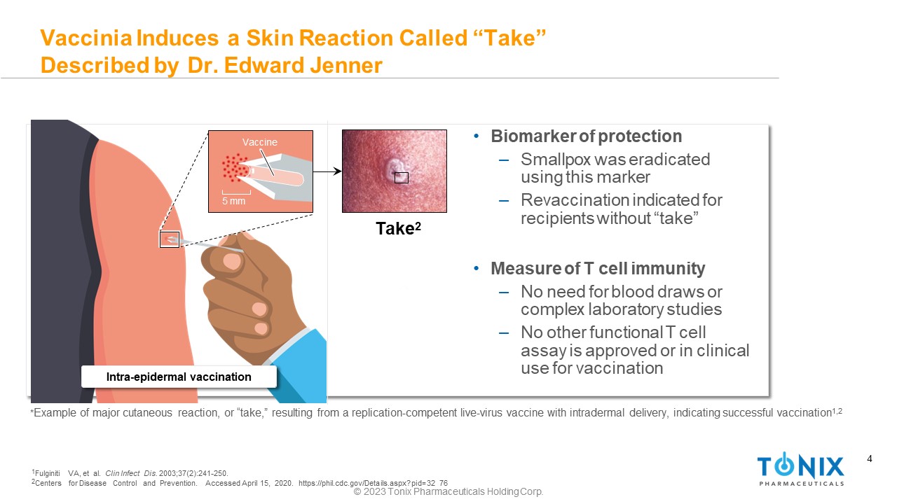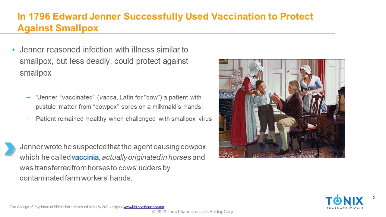 3 In 1796 Edward Jenner Successfully Used Vaccination to Protect Against Smallpox • Jenner reasoned infection with illness similar to smallpox, but less deadly, could protect against smallpox ‒ “Jenner “vaccinated” ( vacca , Latin for “cow”) a patient with pustule matter from “cowpox” sores on a milkmaid’s hands; ‒ Patient remained healthy when challenged with smallpox virus • Jenner wrote he suspected that the agent causing cowpox, which he called vaccinia , actually originated in horses and was transferred from horses to cows’ udders by contaminated farm workers’ hands. The College of Physicians of Philadelphia. Accessed July 15, 2021. https:// www.historyofvaccines.org © 2023 Tonix Pharmaceuticals Holding Corp.