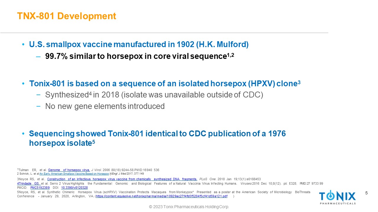 4 Vaccinia Induces a Skin Reaction Called “Take” Described by Dr. Edward Jenner * Example of major cutaneous reaction, or “take,” resulting from a replication - competent live - virus vaccine with intradermal delivery, indicating successful vaccination 1,2 5 mm Vaccine Intra - epidermal vaccination Take 2 © 2023 Tonix Pharmaceuticals Holding Corp. • Biomarker of protection ‒ Smallpox was eradicated using this marker ‒ Revaccination indicated for recipients without “take” • Measure of T cell immunity ‒ No need for blood draws or complex laboratory studies ‒ No other functional T cell assay is approved or in clinical use for vaccination 1 Fulginiti VA, et al. Clin Infect Dis. 2003;37(2):241 - 250. 2 Centers for Disease Control and Prevention. Accessed April 15, 2020. https://phil.cdc.gov/Details.aspx?pid=32 76