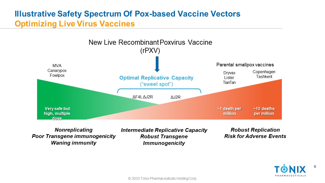 5 TNX - 801 Development • U.S. smallpox vaccine manufactured in 1902 (H.K. Mulford) ‒ 99.7% similar to horsepox in core viral sequence 1,2 • Tonix - 801 is based on a sequence of an isolated horsepox (HPXV) clone 3 − Synthesized 4 in 2018 (isolate was unavailable outside of CDC) − No new gene elements introduced • Sequencing showed Tonix - 801 identical to CDC publication of a 1976 horsepox isolate 5 1 Tulman ER, et al. Genome of horsepox virus. J Virol . 2006 80(18):9244 - 58.PMID:16940 536 2 Schrick, L. et al An Early American Smallpox Vaccine Based on Horsepox N Engl J Med 2017; 377:149 3Noyce RS, et al.. Construction of an infectious horsepox virus vaccine from chemically synthesized DNA fragments. PLoS One . 2018 Jan 19;13(1):e0188453 4Trindade GS , et al. Serro 2 Virus Highlights the Fundamental Genomic and Biological Features of a Natural Vaccinia Virus Inf ecting Humans. Viruses 2016 Dec 10;8(12). pii: E328. PMID:27 9733 99 PMCID: PMC5192389 DOI: 10.3390/v8120328 5Noyce, RS, et al. Synthetic Chimeric Horsepox Virus (scHPXV) Vaccination Protects Macaques from Monkeypox* Presented as a poster at the American Society of Microbiology BioThreats Conf erence - January 29, 2020, Arlington, VA. ( https://content.equisolve.net/tonixpharma/media/10929ac27f4fb5f5204f5cf41d59a121.pdf ) © 2023 Tonix Pharmaceuticals Holding Corp.