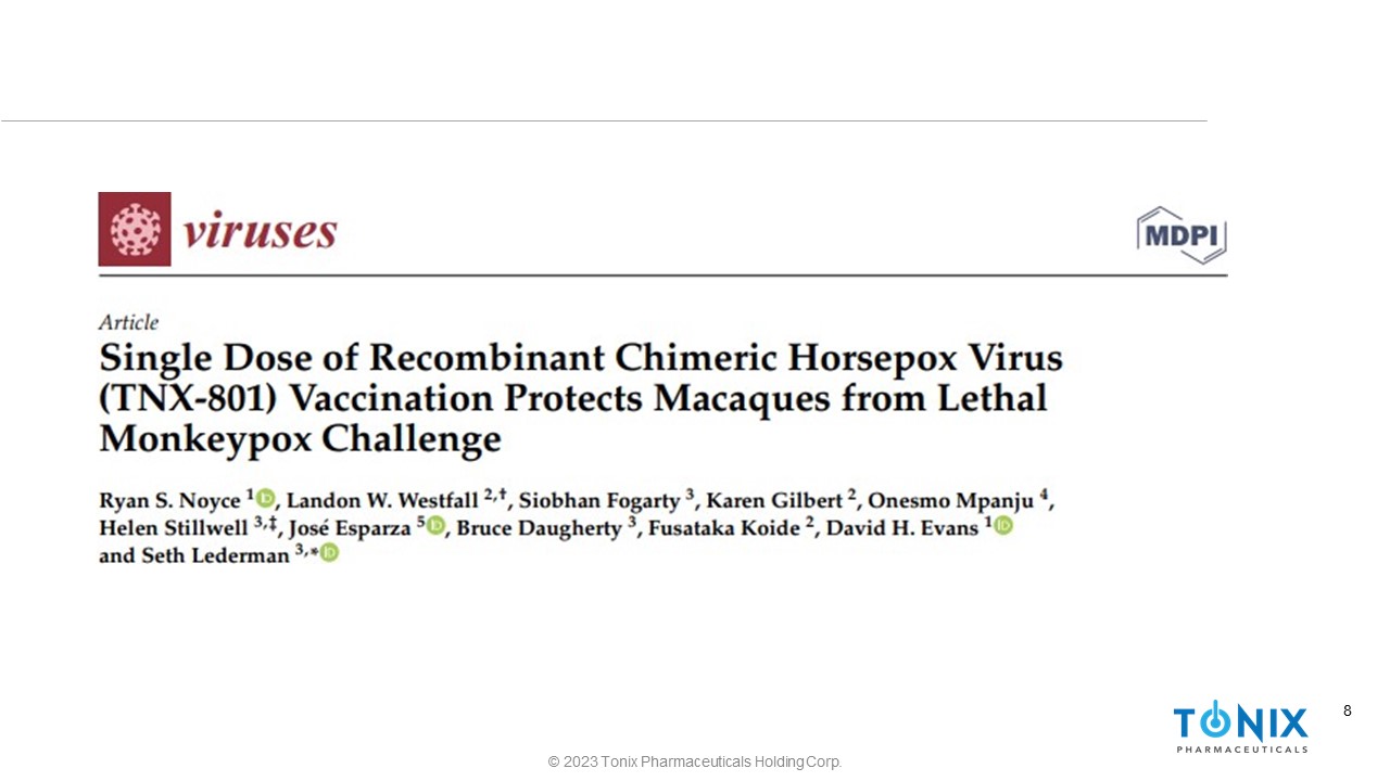 TNX - 801: A Novel Mpox Vaccine: Live, Replicating, Attenuated Orthopoxvirus (Horsepox) Vaccine Zeil Rosenberg MD Executive Vice President, Medical World Vaccine Congress Washington DC, April 5, 2023 © 2023 Tonix Pharmaceuticals Holding Corp.