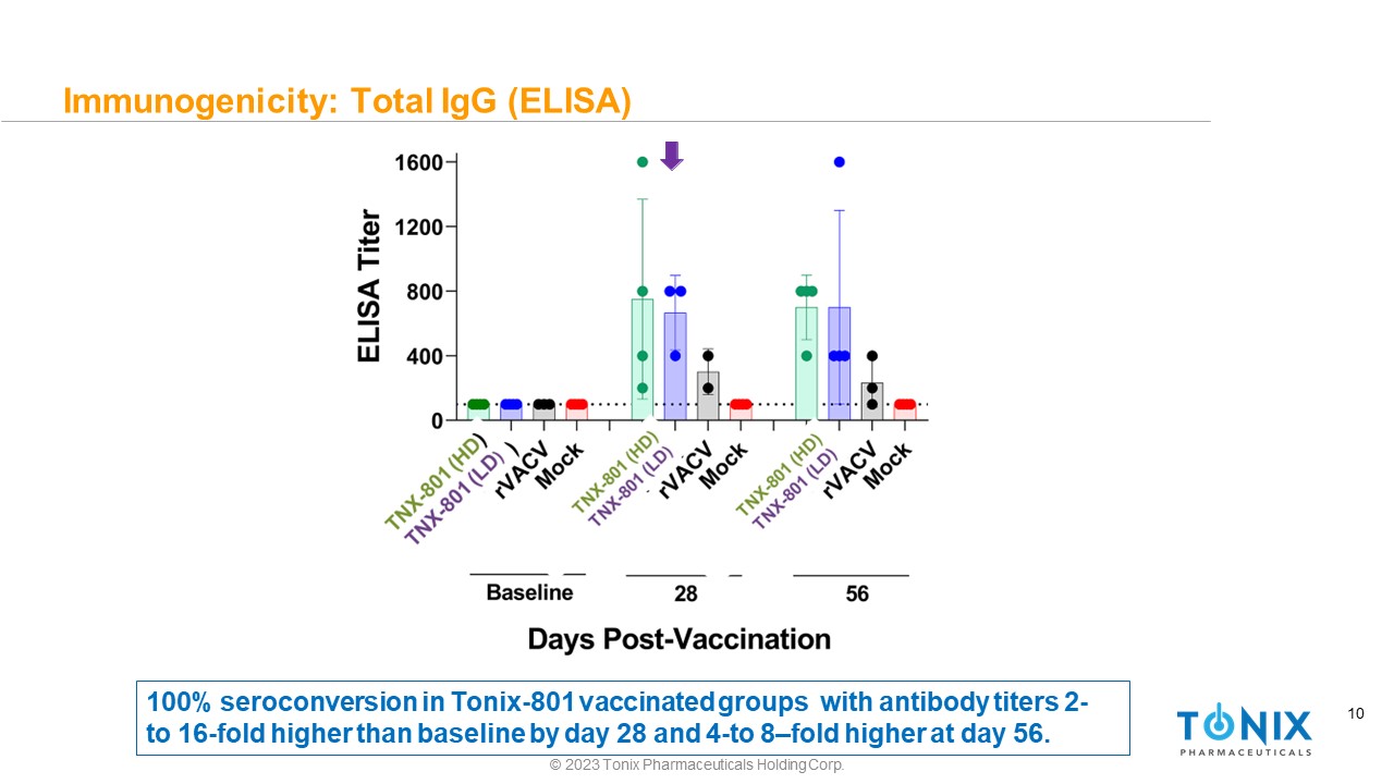 9 TNX - 801 Vaccination and Lethal Challenge in Macaques “Take” observed in all TNX - 801 vaccinated NHPs except one. • If no take by day 7 were revaccinated on day 14. Post - vaccination, no NHP showed lesions during first 60 days TNX - 801 (High Dose) TNX - 801 (Low Dose ) © 2023 Tonix Pharmaceuticals Holding Corp.