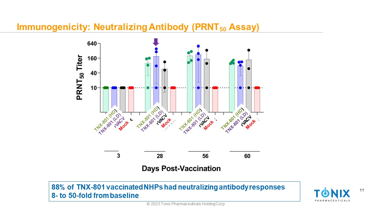 10 Immunogenicity: Total IgG (ELISA) 100% seroconversion in Tonix - 801 vaccinated groups with antibody titers 2 - to 16 - fold higher than baseline by day 28 and 4 - to 8 – fold higher at day 56. © 2023 Tonix Pharmaceuticals Holding Corp.