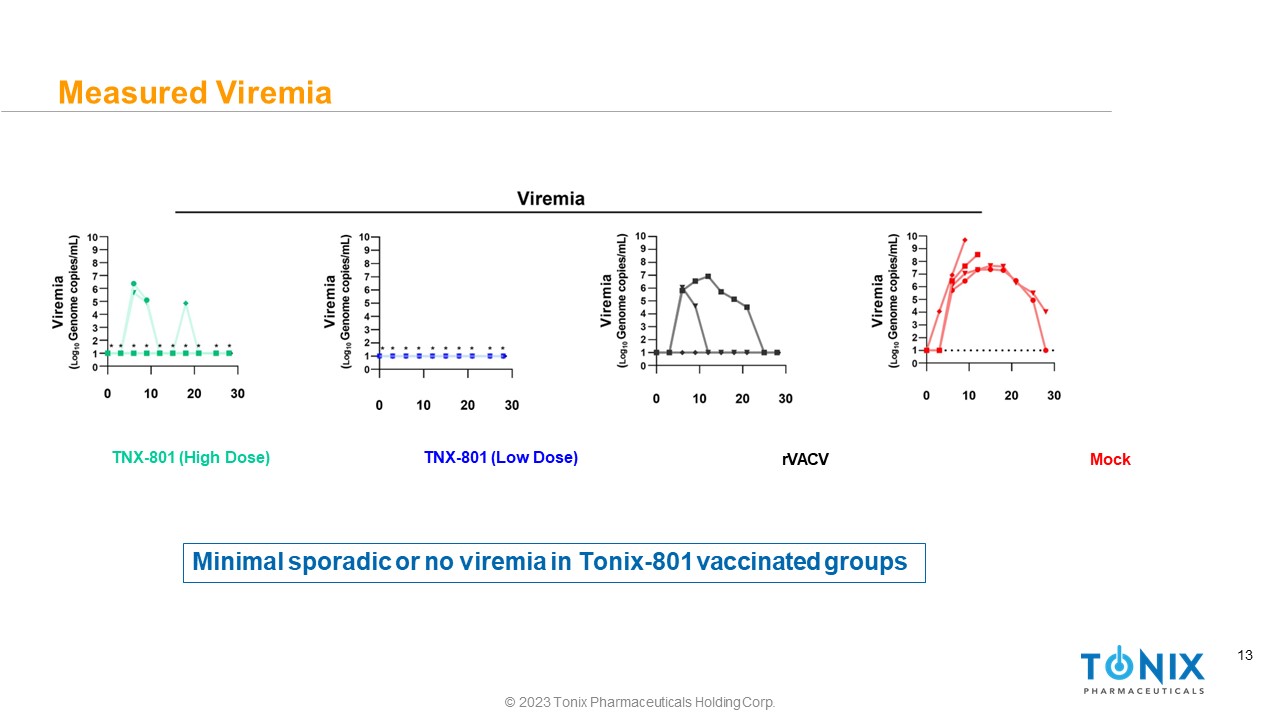 12 Measured Virus Shedding: Oral Swabs TNX - 801 (High Dose) © 2023 Tonix Pharmaceuticals Holding Corp. TNX - 801 (Low Dose) rVACV Mock Minimal or no virus shedding in Tonix - 801 vaccinated groups