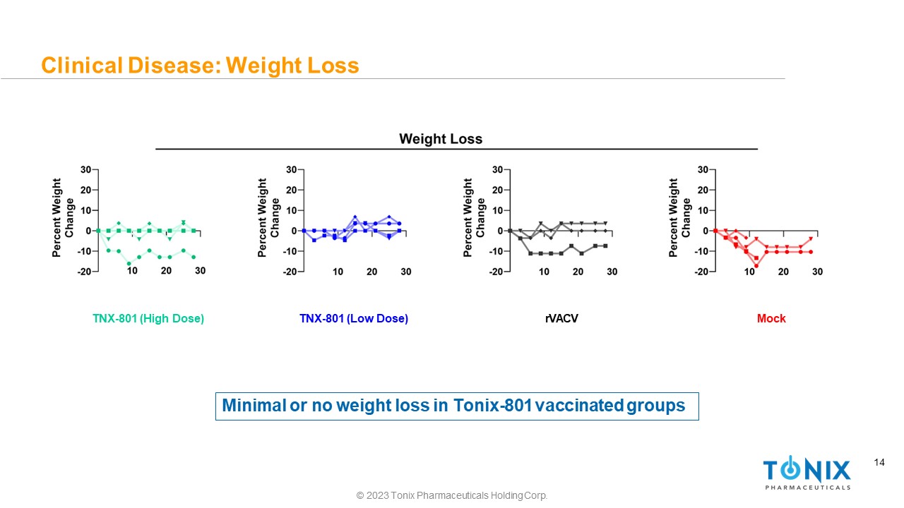 13 Measured Viremia TNX - 801 (High Dose) © 2023 Tonix Pharmaceuticals Holding Corp. TNX - 801 (Low Dose) rVACV Mock Minimal sporadic or no viremia in Tonix - 801 vaccinated groups