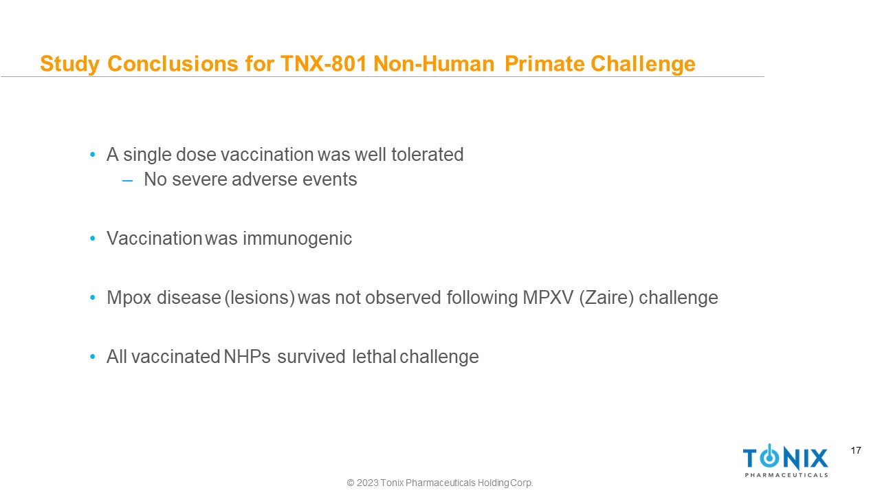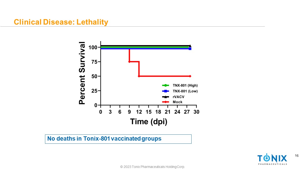 16 Clinical Disease: Lethality No deaths in Tonix - 801 vaccinated groups © 2023 Tonix Pharmaceuticals Holding Corp.