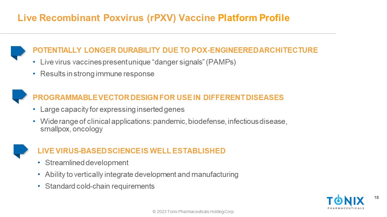 18 Live Recombinant Poxvirus (rPXV) Vaccine Platform Profile POTENTIALLY LONGER DURABILITY DUE TO POX - ENGINEERED ARCHITECTURE • Live virus vaccines present unique “danger signals” (PAMPs) • Results in strong immune response PROGRAMMABLE VECTOR DESIGN FOR USE IN DIFFERENT DISEASES • Large capacity for expressing inserted genes • Wide range of clinical applications: pandemic, biodefense, infectious disease, smallpox, oncology LIVE VIRUS - BASED SCIENCE IS WELL ESTABLISHED • Streamlined development • Ability to vertically integrate development and manufacturing • Standard cold - chain requirements © 2023 Tonix Pharmaceuticals Holding Corp.